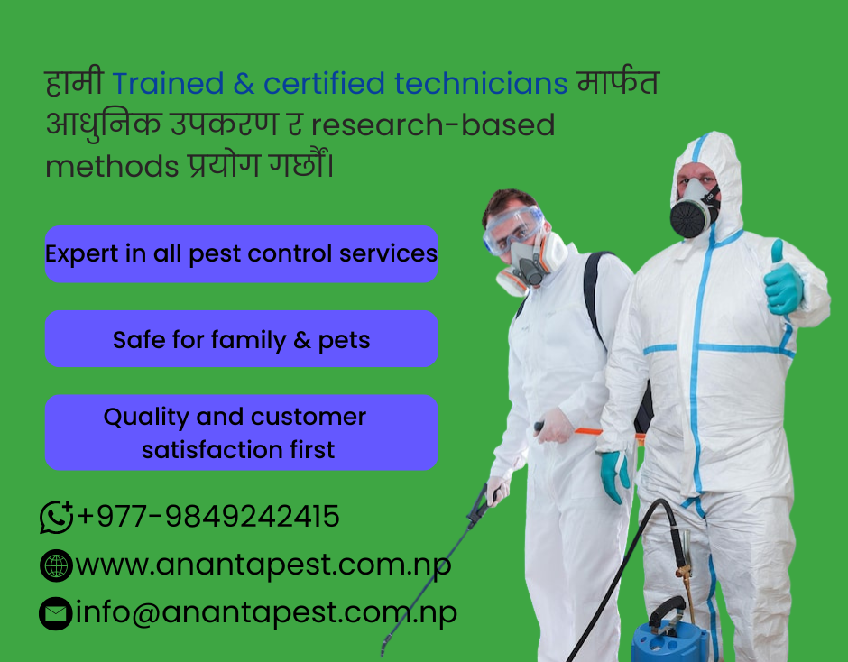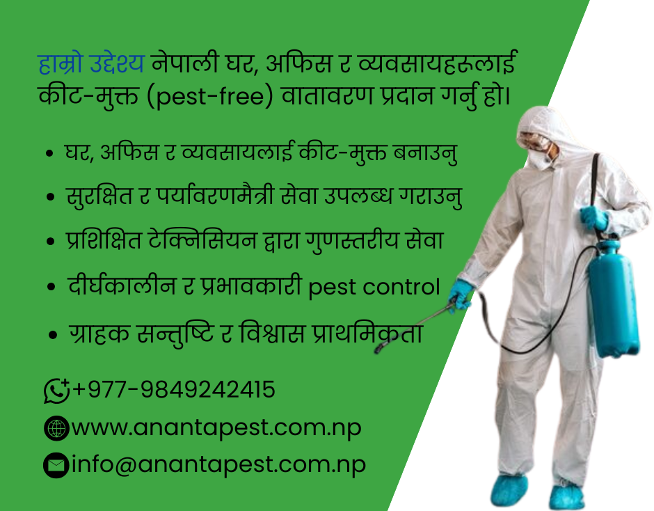 Ananta Pest Control & Research Center Pvt. Ltd. is a leading, government-authorized pest control company. Established in 2071 B.S., we hold a valid license from the Pesticide Board under the Ministry of Agriculture, Government of Nepal.